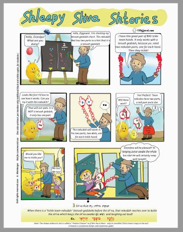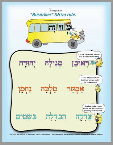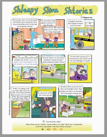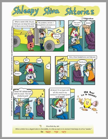 Stories can help teach most concepts, even the Shv’a Na/Nach rules which are confusing for many adults, let alone children. The rules have been divided to five basic rules, according to the letters of the Aleph Beis: Aleph (1st letter), Beis (2 sh’vas), Gimmel (tenuah Gedolah) , Daled (Dagesh), Hei (Hadomos, i.e. similar letters). Each rule is presented with a cute comic story and then an illustrated practice reading page to review and apply the rule.